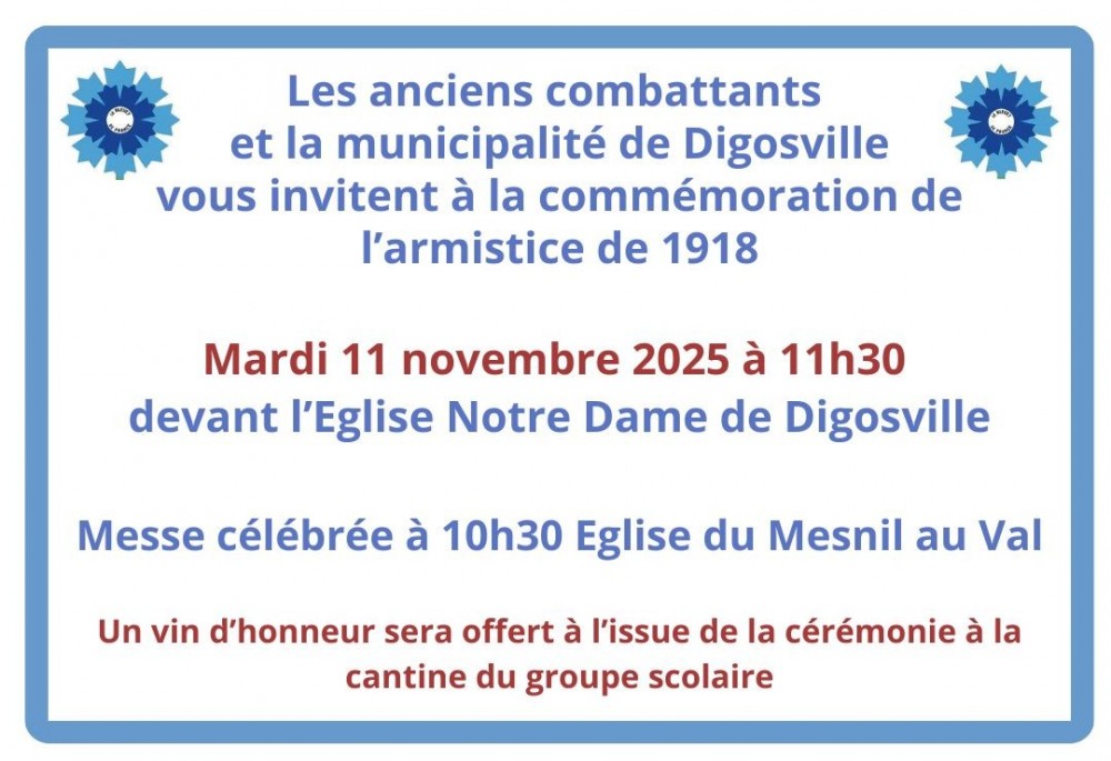 Les anciens combattants et la municipalité de Digosville vous invitent à la commémoration de l'armistice de 1918