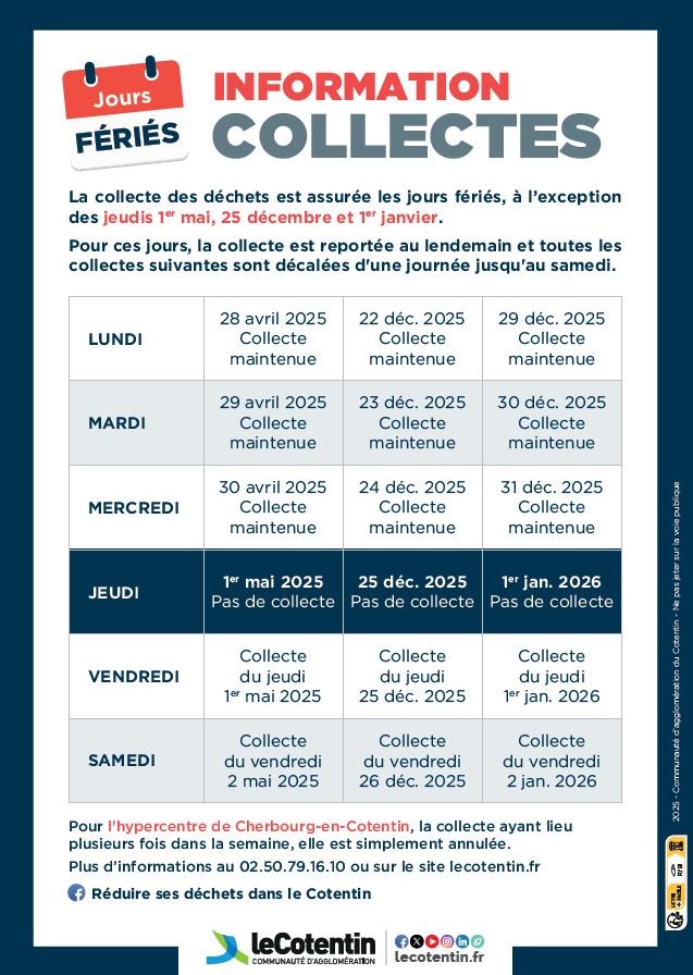 • la collecte ne sera pas assurée les 25 décembre et 1er janvier mais décalée au jour suivant c'est à dire que si votre commune est habituellement collectée le jeudi, la collecte aura lieu le vendredi et si votre collecte a lieu le vendredi, elle sera décalée au samedi