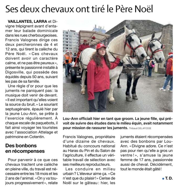 Article de la presse de la Manche du 22 décembre 2025- Les chevaux de Francis VALOGNES ont tiré le père Noel