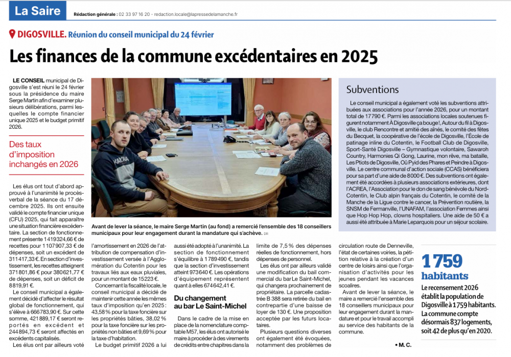 Article de la Presse de la Manche du 10 mars 2026 - Les finances de la commune excédentaires en 2025