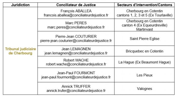 Ci dessous le tableau des conciliateurs de justice pour le tribunal judiciaire de Cherbourg.